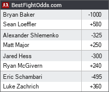 I think the dogs all have value, but not convinced enough to bet any of them. McGivern/Hess will be competive (if the same McGivern from 2 years ago shows up). Schmelenko/Major is a kickboxing match, I really don't bet on straight striking matches. I like Shambari the best of anyone, but that is reflected in the line. I don't know that I like him that much.