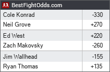 Konrad seems like he has a pretty good chin though. I know he lacks finishing ability typically. He likes to just wrestle guys it seems like. If he has to win by wrestling Neil Grove for 15 minutes that is a long time to go without getting tagged with a good shot from him. Konrad is a bit of a gasser but I wouldn't be suprised if Neil Grove is also.