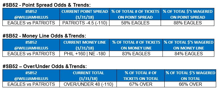 had the first sports books in Vegas dropping down to -4 (-110) on Friday and after a full weekend of action they raised the juice on the Eagles to + 4 -115 (Patriots -4 -105).
