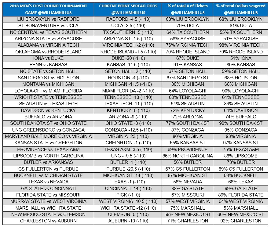 The only game in the opening round that had seen a 2-point line-movement at the South Point was the First Four clash between Texas Southern and North Carolina Central. Texas Southern opened as a 6-point favorite, but quickly was bet down to -4.